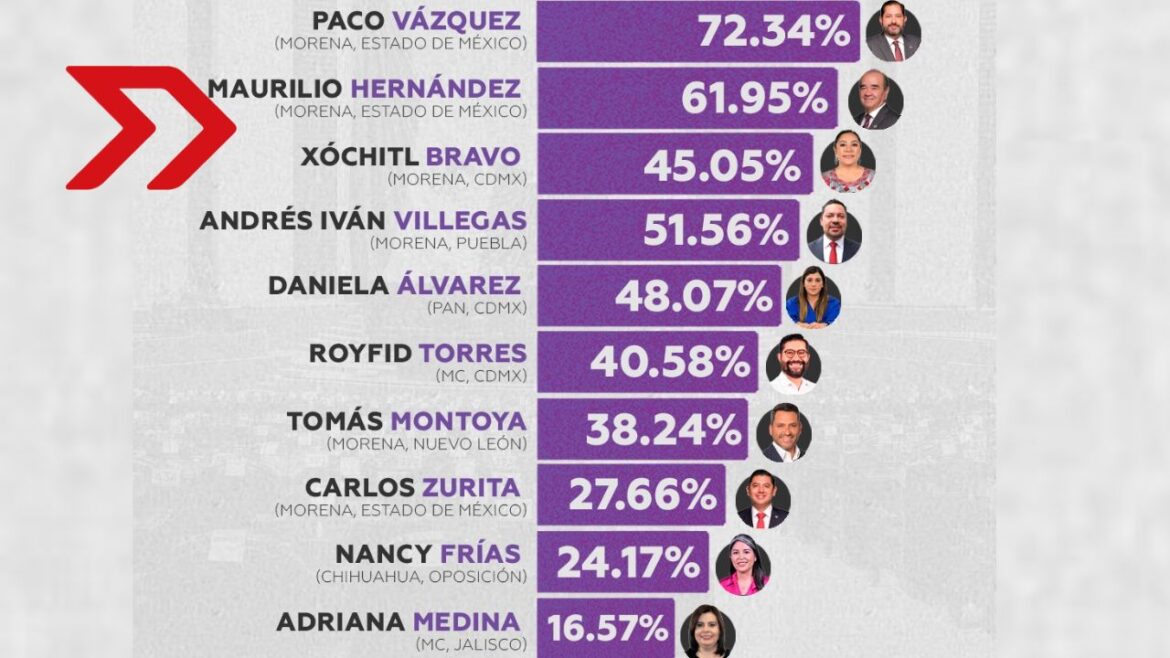 El listado continúa con Royfid Torres González (MC, CDMX) con 40.58%, Tomás Roberto Montoya Díaz (Morena, Nuevo León) con 38.24%, Carlos Zurita (Morena, Estado de México) con 27.66%, Nancy Frías (oposición, Chihuahua) con 24.17% y Adriana Medina (MC, Jalisco), que cierra el top 10 con 16.57%.