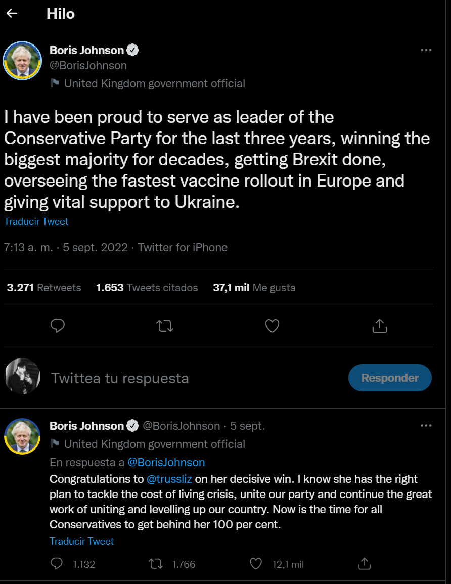 Poco antes, el que era el primer ministro, Boris Johnson, había presentado su renuncia formal a la monarca, después de haber anunciado el pasado 7 de julio su intención de dimitir.