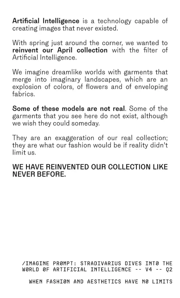 “La inteligencia artificial es una tecnología capaz de crear imágenes que nunca existieron. Con la primavera a la vuelta de la esquina hemos querido reinventar nuestra colección de abril con el filtro de la inteligencia artificial”, explica la marca.