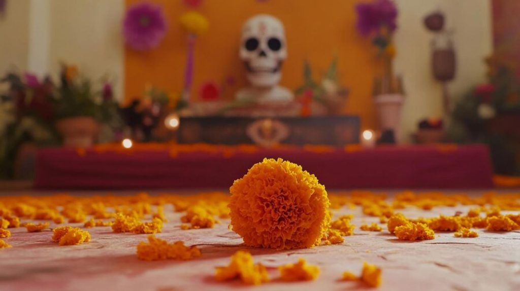 La flor cempasúchil, con su leyenda de amor eterno, es la flor característica del Día de Muertos. Sus pétalos se utilizan para crear un camino desde la entrada de la casa hasta la ofrenda y se colocan flores enteras en el altar. Su color y aroma guían a las almas de regreso a casa.
