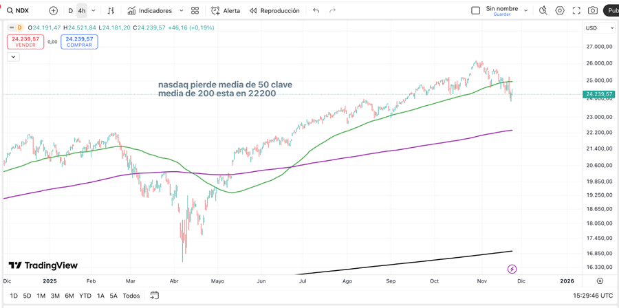 El S&P 500 y el Dow Jones también perdieron sus medias de 50 días, reforzando un escenario de mayor volatilidad. El índice Fear & Greed de CNN muestra lecturas de miedo extremo, lo que confirma el sentimiento defensivo del mercado.
